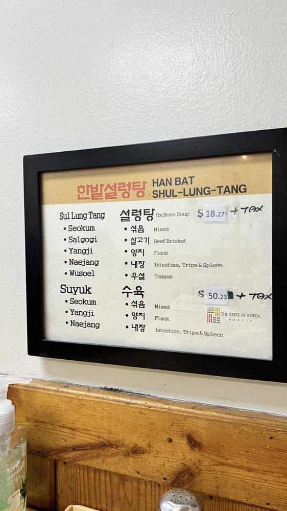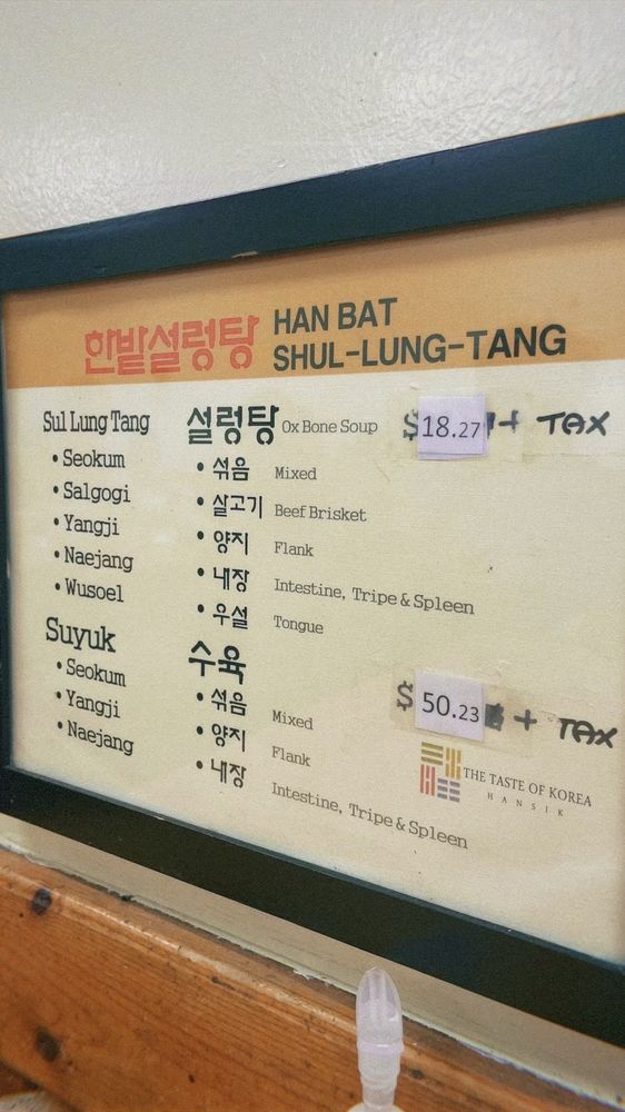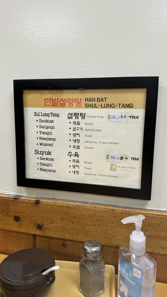 Welcome to Han Bat Sul Lung Tang, a hidden gem in Los Angeles offering traditional Korean soup dishes. Located in Koreatown, this restaurant is known for its Sul Lung Tang, a soothing bone broth soup with various meat options like Salgogi, Yangji, Naejang, Seokum, and Wuseol. Customers rave about the consistent quality of the food, quick service, and the homemade side dishes like kimchi and pickled radishes that complement the flavorful broth. The ambiance is cozy, perfect for meaningful conversations and enjoying a comforting meal. With a limited but focused menu, Han Bat Sul Lung Tang stands out for its authentic flavors and inclusive atmosphere where staff members from diverse backgrounds come together to create a welcoming dining experience. Whether you're craving a clean, healthy bone broth or a simple, delicious meal, Han Bat Sul Lung Tang is the place to be.